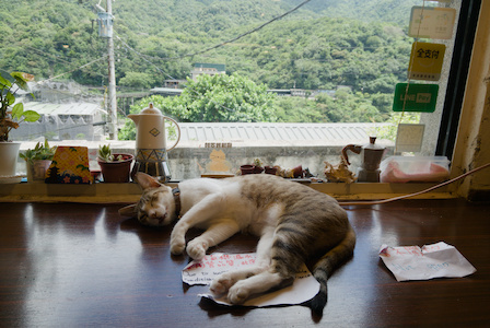 猴硐猫村の上のほうの通りには観光客向けのカフェが並んでいて、てきとうに入ってみたところ、ちゃんと看板猫がいた。まだ若い個体だったようで、寝てるだけじゃなくけっこう遊んだり走り回ったりすることもあってサービス満点だ。