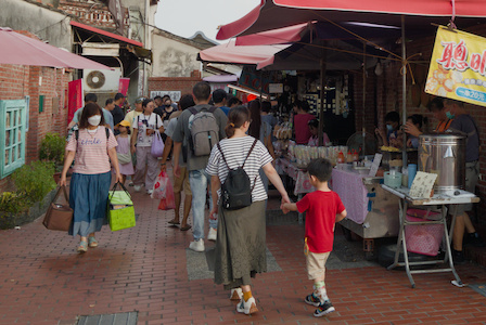 そしてしばらく歩きまわり、そろそろここの滞在も終わりかなあとなってきた夕方、急に人でいっぱいの通りに行きあたって大変びっくりした。どうも、鹿港の町で「古くからの町並みが残っていて観光客に人気」というのは、要するにほぼ埔頭街周辺に限られるようだ。あとは天后宮の周辺の道ぐらいしか観光客が集まるエリアはなさそう。ふつうに車が通る大通りでジュースとか台湾おにぎりとか買ってる場合ではないのである。